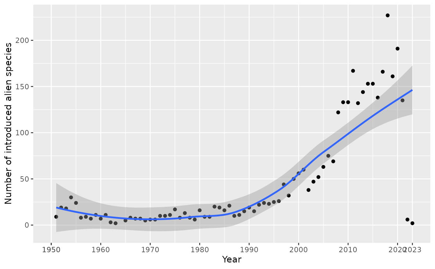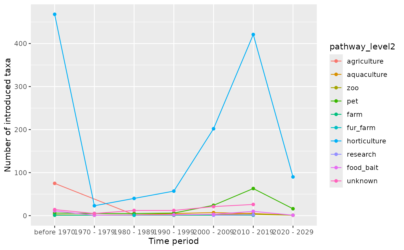 #> # native_range <chr>, native_continent <chr>, habitat <chr>, marine <lgl>, …Time of introduction